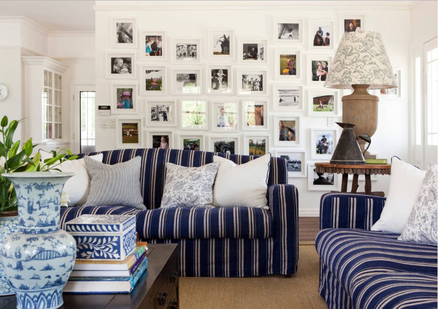 С помощью сюжетных или личных фотографий в едином стиле можно наполнить гостиную уютом и добавить в атмосферу особой эмоциональности.