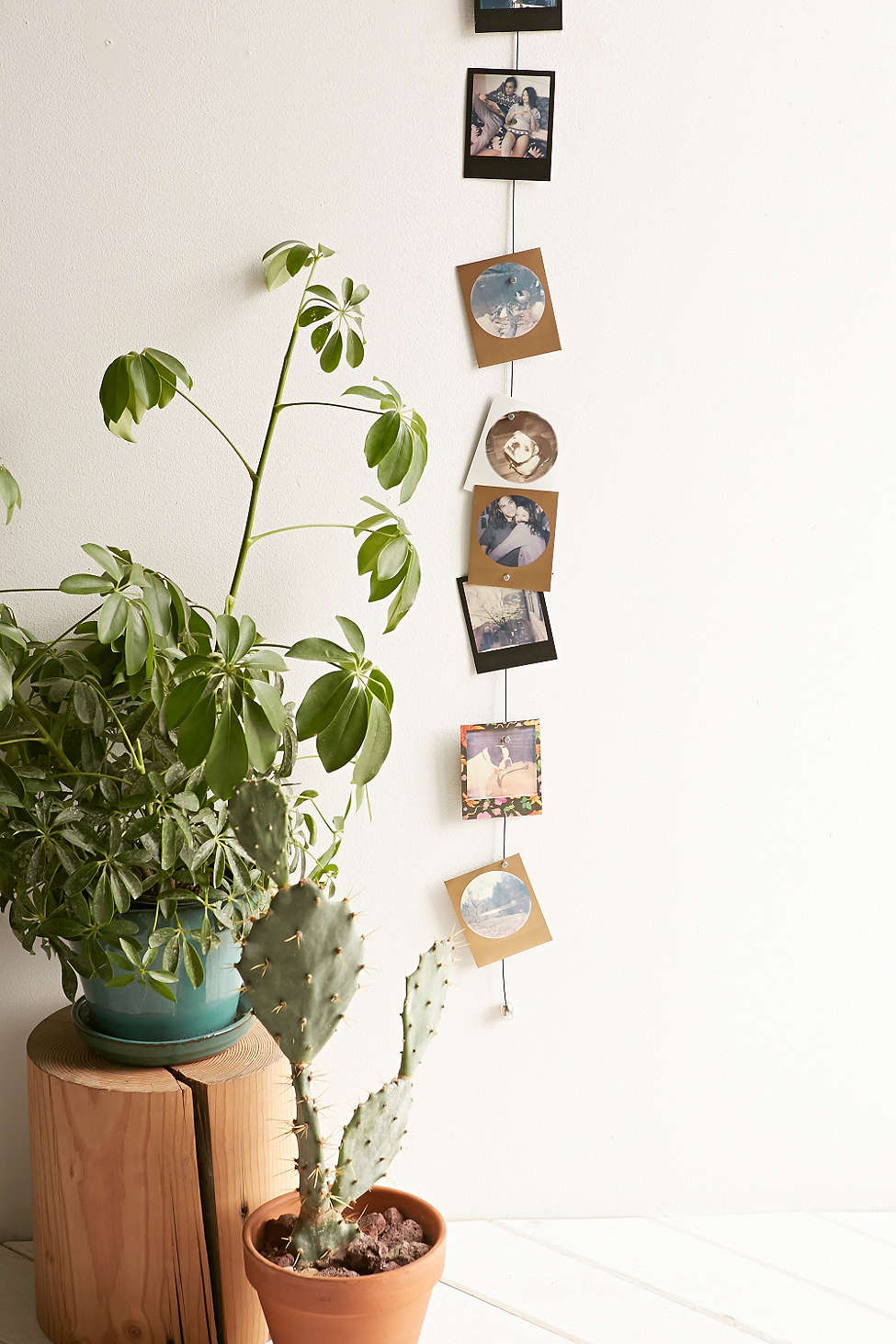 - Цеплять снимки можно на верёвку. Достаточно вбить в стену два гвоздя и натянуть между ними нить. И так в несколько рядов. Крепить на нити фото можно крючками, прищепками, привязывать за те же веревочки. Натянутость нити можно регулировать, создавая интересный эффект провисания.