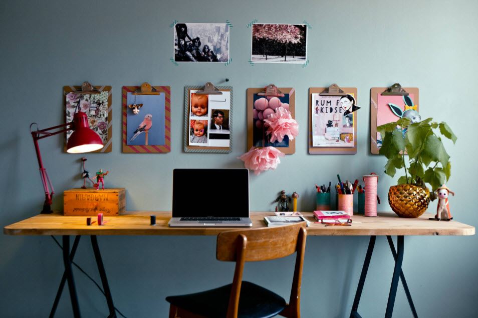 Как вариант — скомбинировать фотографии с декором. Черно-белые снимки или негативы будут идеально смотреться с аксессуарами из бумаги. Оформлять подобные варианты лучше всего в углу комнаты. Чтобы композиция максимально соответствовала тематике, можно оформить соответствующим образом прищепки. Лучше приобрести цветные салфетки и оклеить ими лицевую сторону держателей.