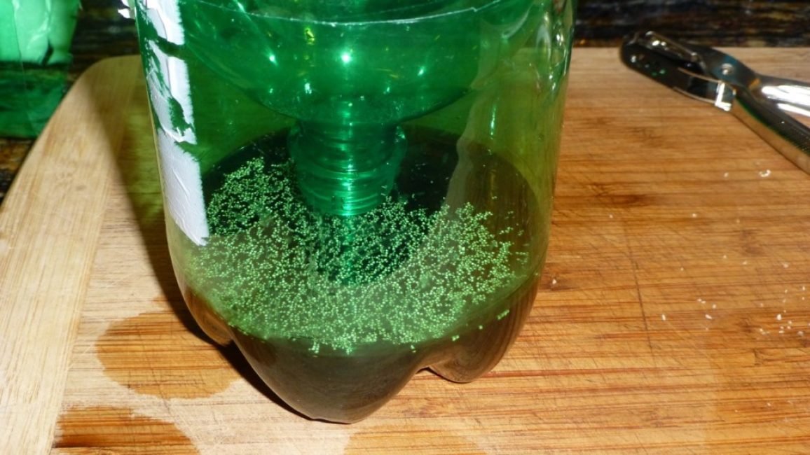 Первое что нужно сделать, это разрезать и вставить верхнюю часть внутрь тары так, чтобы горлышко находилось примерно в 5 см от дна. В качестве приманки стоит использовать сахарно-дрожжевой сироп. Для его приготовления нужно взять дрожи, сахар и перемешать их в горячей воде.