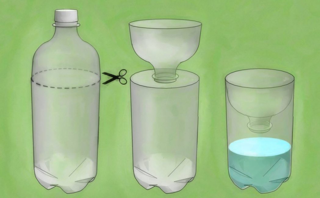 Разрежьте бутылку и вставьте верхнюю часть внутрь тары так, чтобы горлышко находилось примерно в 5 см от дна