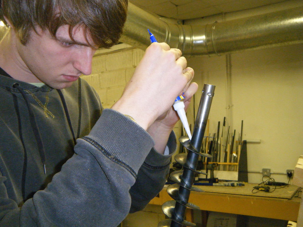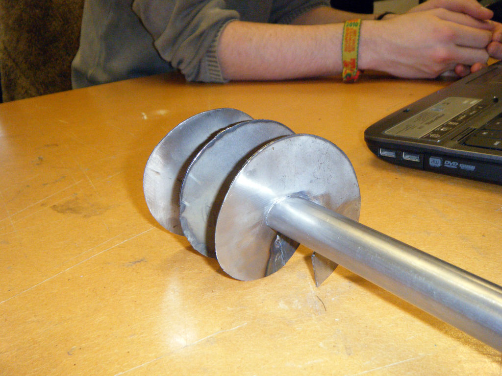 Затем мы приварили каждый диск к центральному полюсу с помощью газосварщика, и, обнаружив при изготовлении прототипов, газосварщик дал намного более чистую поверхность, чем дуговая сварка. Это создало лопасти винта. Сварка привела к тому, что центральный полюс слегка деформировался, поэтому пришлось вручную отогнуть полюс так, чтобы он был максимально прямым. Это заняло некоторое время! Мы сделали опоры, чтобы винт мог сидеть так, чтобы он удерживался на одном уровне и охватывал его, используя сверло, чтобы увидеть, где было искривление, затем нам пришлось согнуть его вручную. Также на этом этапе, когда мы попытались установить винт в водосточной трубе, он был слишком плотным, поэтому нам пришлось шлифовать некоторые лезвия, используя угловую шлифовальную машину. Чтобы выяснить, какие лезвия нуждаются в шлифовании, мы затолкнули винт в трубу и отогнули его от сверла, это заставило винт разрезать внутреннюю часть трубы, и когда мы вытащили винт, лезвия, на которых было много пластика, и поэтому больше всего врезались в трубу, были те, которые нуждались в шлифовании.