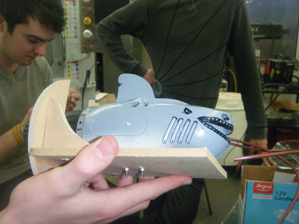 Мы должны были найти способ надежно удерживать двигатель над винтом, и его также нужно было удерживать таким образом, чтобы он не мог вращаться. Для размещения двигателя мы использовали корпус из дешевой дрели, так как он был уже подходящего размера, поэтому идеально подходил к двигателю и патрону. Мы отрезали ручку сверла и отшлифовали неровные края, чтобы получить правильную форму. Мы, как Team Shark, решили немного позаботиться о том, чтобы корпус двигателя выглядел как акула, поэтому сначала мы спрей покрасили корпус в белый цвет, а затем закрасили сверху серо-голубой цвет. Мы добавили плавник MDF и вуаля. Как я уже сказал, это немного забавно, и прошло время, пока мы ждали, чтобы все было сделано на семинаре. Двигатель не вращается, поскольку он привинчен к задней пластине держателя, и держатель будет надежно прикреплен к раме.