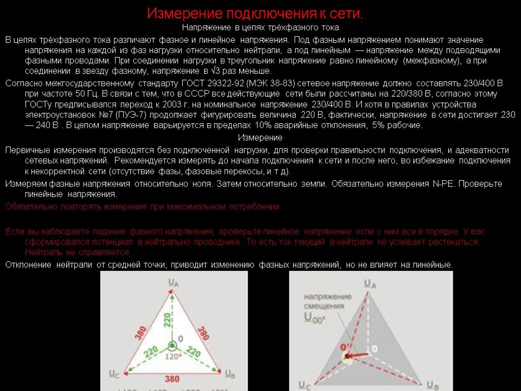 В трехфазных сетях переменного тока большинства стран стандартное фазное напряжение равно приблизительно 220 вольт — напряжение между фазным проводом и нейтральной точкой, которая обычно заземляется, и ее потенциал принимается равным нулю, потому она и называется еще нулевой точкой .