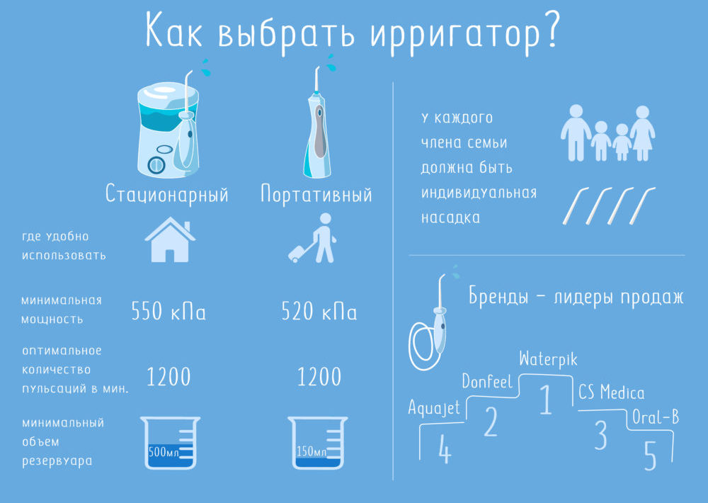 Ответ на вопрос, как выбрать ирригатор для рта, лежит на поверхности. Определитесь, как часто и в каких условиях вы будете им пользоваться. Сопоставьте эту информацию с особенностями конструкции, типом работы (микропузырьковый/импульсный), предлагаемыми режимами работы и насадками, объемом резервуара, давлением струи.