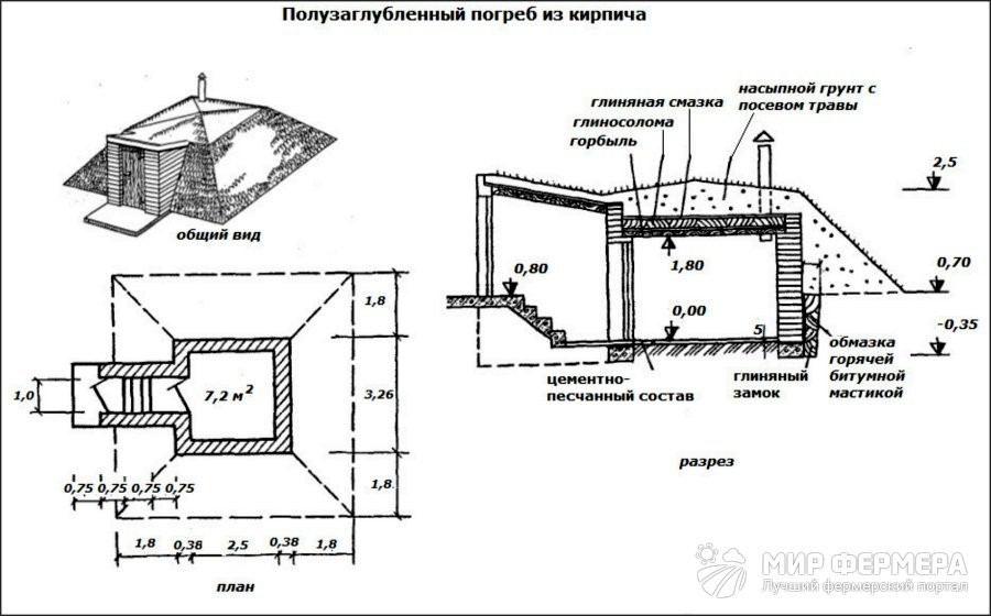 Такой вид сооружения – наиболее оптимальный для строительства хранилища овощей и фруктов. Внешне он схож с наземным строением, но отличается тем, что только часть конструкции выступает над поверхностью почвы, а другая располагается под ней. Как правило, глубина ямы, в которую уходит строение, составляет не более 1,5 метров.