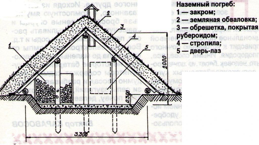 Перекрытие здесь делается из досок, покрываемых мятой глиной и слоем рубероида. Обваловку делают грунтом, который после укладки увлажняется, трамбуется и обкладывается дерном.