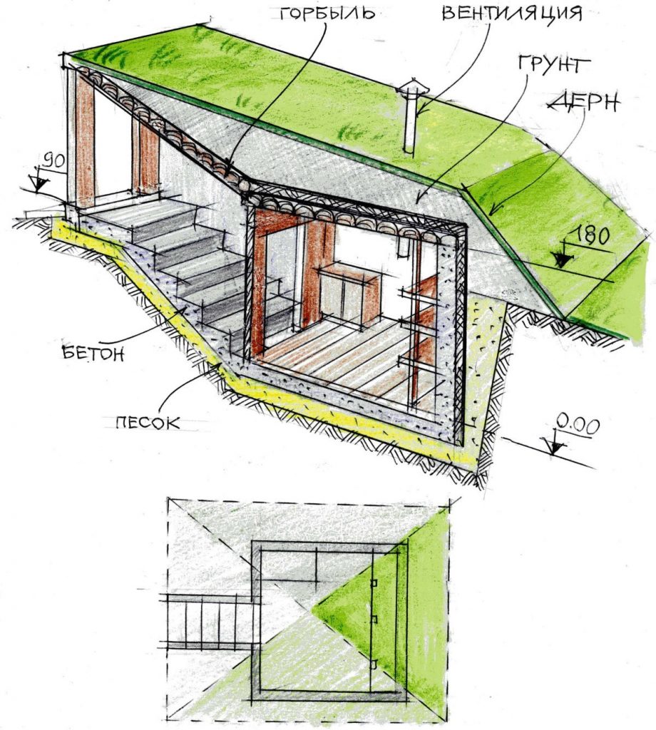 Если максимальный уровень подъема почвенной воды находится на глубине 1,5-2,0 метра, то строение заглубляют в грунт на половину его высоты. При глубоком залегании водоносного пласта хранилище можно полностью вкопать в грунт, оставив на поверхности пологую крышу, покрытую дерном.