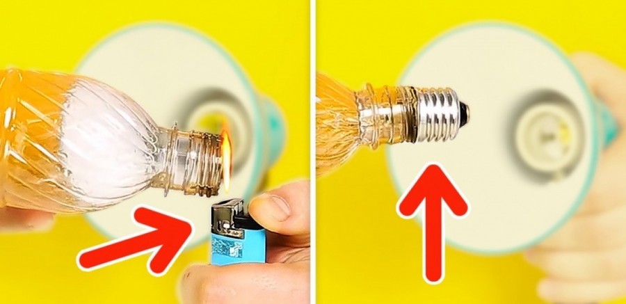 Берем бутылку, отворачиваем пробку, а горлышко оплавляем в пламени зажигалки. Быстро вставляем горлышко в цоколь и ждем, пока пластик не застынет. После этого крутим бутылку против часовой стрелки и выворачиваем цоколь, не забывая придерживать патрон за юбку другой рукой.