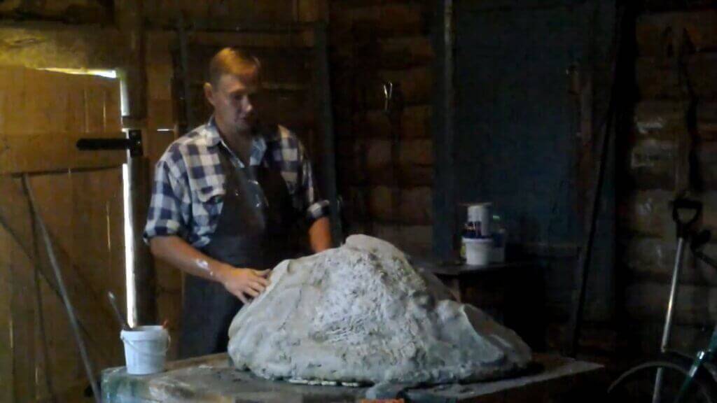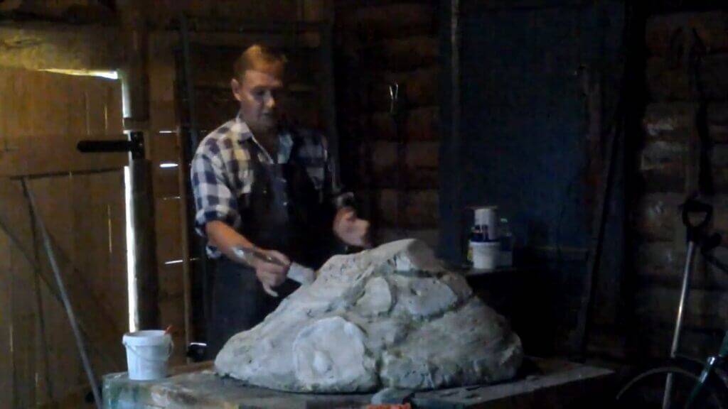 После того, как конструкция затвердела, мы начинаем при помощи ножа делать грани, придавая ей вид камня. После этого разводим в ведёрке цементное молочко, по густоте напоминающее жидкий кефир. Берём для этого 1 часть цемента и 4 части воды. Пропитываем наш искусственный камень цементным молочком при помощи кисти. Затем, после того, как камень подсохнет, наносим сверху ещё цементную массу с песком (цемент — 1 часть, песок — 3 части, врда — 0,5 части).