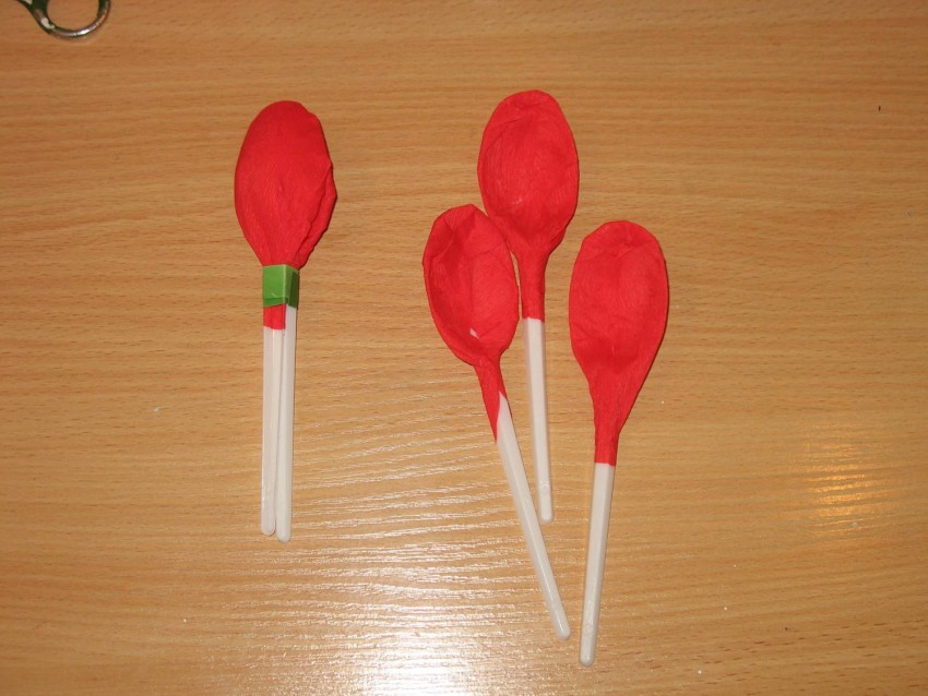 Дальше скрепляем наши ложки цветным или обычным скотчем. Наш цветок почти готов, осталось лишь добавить салфетки на стебель. Это сделать очень просто. Нам нужно обмотать конец ложки зелёной салфеткой и по желанию сделать из той же салфетки листик. Обязательно закрепить. Цветок готов!