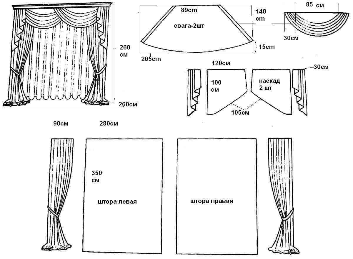 Изготовление таких украшений для окон производится различными методами. Особенные навыки для этого необязательны. Обучаться мастерству по пошиву ламбрекенов лучше начинать с простейших моделей. Для их создания вам не понадобятся даже эскизы выкроек. Основным фактором в их изготовлении будет учет размеров изделия и внешних характеристик изделий. Длину, ширину ламбрекенов, штор надо примерно рассчитывать, как на изображении ниже.