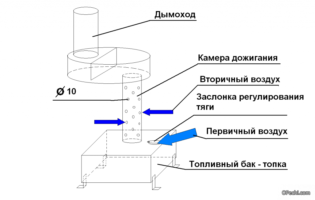 Руководствуясь предложенным чертежом, можно изготовить классическую печь на отработке в гараж. Топливо заливается в нижний резервуар, для его розжига используется горючая жидкость. Выделяющиеся пиролизные газы в перфорированном дожигателе смешиваются с воздухом, и догорают уже в верхней камере, снабженной внутренней перегородкой.