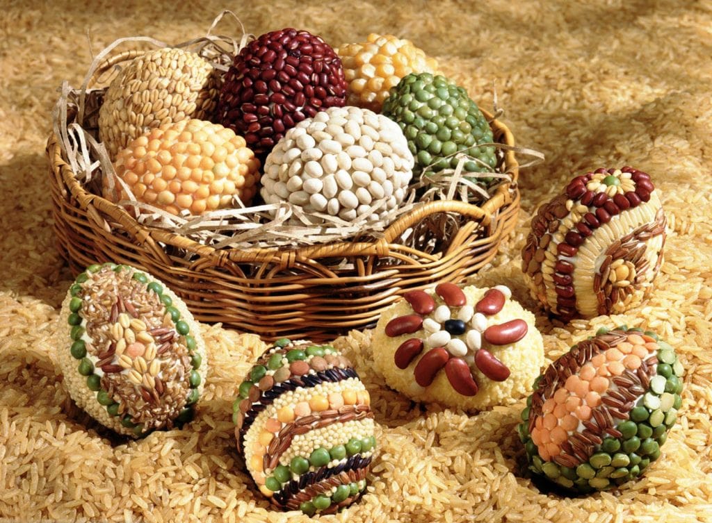 Аналогичным образом можно украсить декоративные интерьерные шары. Желательно использовать основу из пенопласта разного диаметра и несколько видов круп, а также бобовые.