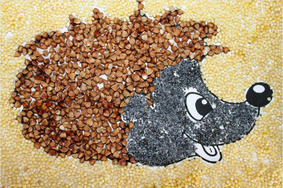 - насыпание и приклеивание. Для создания таких картин малыш будет использовать клей, не него насыпается крупа или семена, заполняющие определенную площадь;