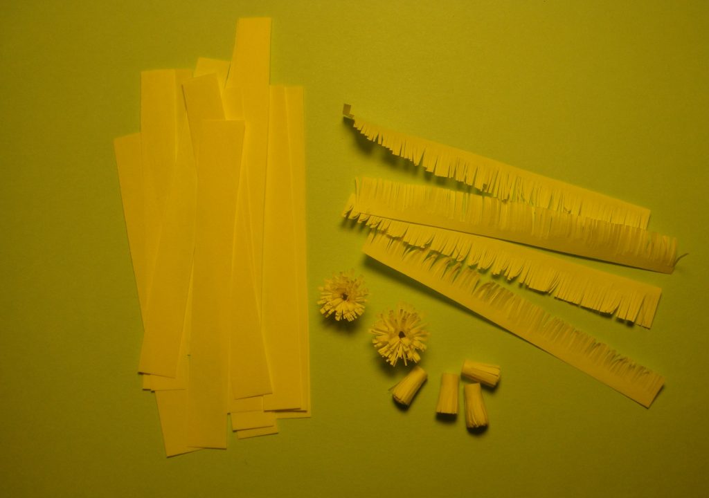Теперь можно переходить к созданию цветов. Они у мимозы небольшие, но очень пушистые. Для их изготовления понадобятся желтые салфетки, которые нарезаются на полоски по 3 сантиметра, каждая из которых складывается пополам. После этого нужно сделать множество надрезов по одному сантиметру по всей длине полосы. Далее каждый отрезок сворачивается по неразрезанной стороне в рулончик. Вторая сторона должна получиться пушистой. Таких цветочков нужно сделать нечетное количество, а после наклеить их на заранее подготовленную основу-стебель.
