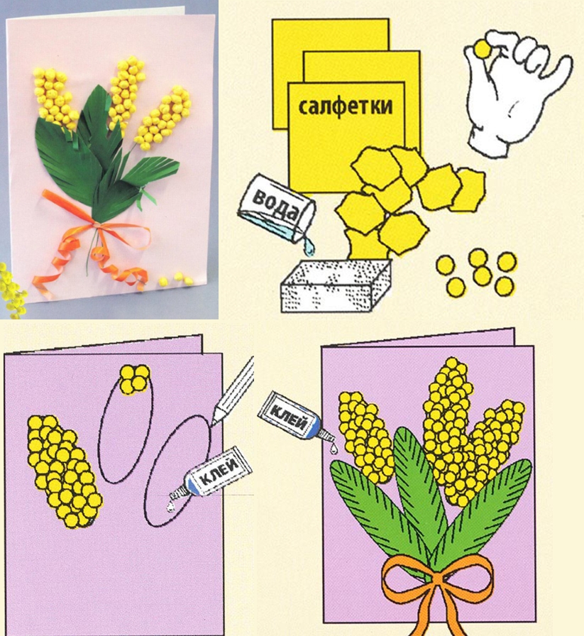 Лситья и стволы мимозы можно изготовить из бумаги, а цветочки можно сделать из выкрашенного пенопласта, пряжи или из салфетки