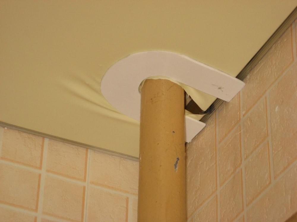 Во многих помещениях к потолку подходят газовые или водопроводные трубы. Для того, чтобы потолок вокруг них выглядел красиво, нужно сделать вырез по форме трубы и усилить в этом месте полотно, чтобы разрез со временем не увеличился.
