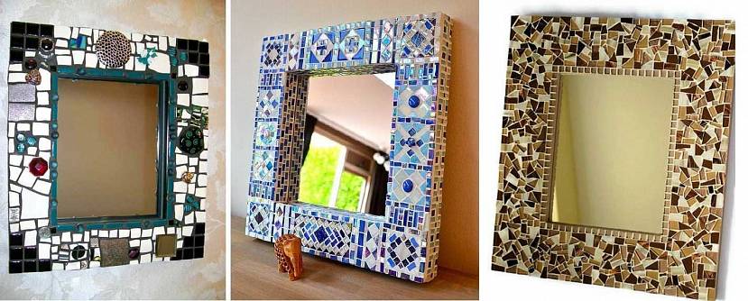 Неизменной популярностью пользуются зеркальные рамы. Материалом для такого обрамления служит зеркальное стекло со специальным напылением. Его изготавливают в виде зеркальной мозаики или зеркальной плитки; производятся варианты с фасцетом и без, с пескоструйным рисунком, разных оттенков. Оформление получится бюджетным, если в доме скопилось некоторое количество маленьких зеркал от косметических средств (теней или пудрениц).