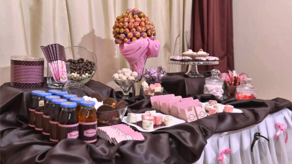 Начать стоит с выбора самого стола. Исходить нужно из количества и объема сладостей. Например, легкая композиция из леденцов, конфет или кексов будет хорошо смотреться на небольшой мебели. А тяжелые торты, пироги или объемные сооружения из конфет лучше расставить на большом, устойчивом столе.