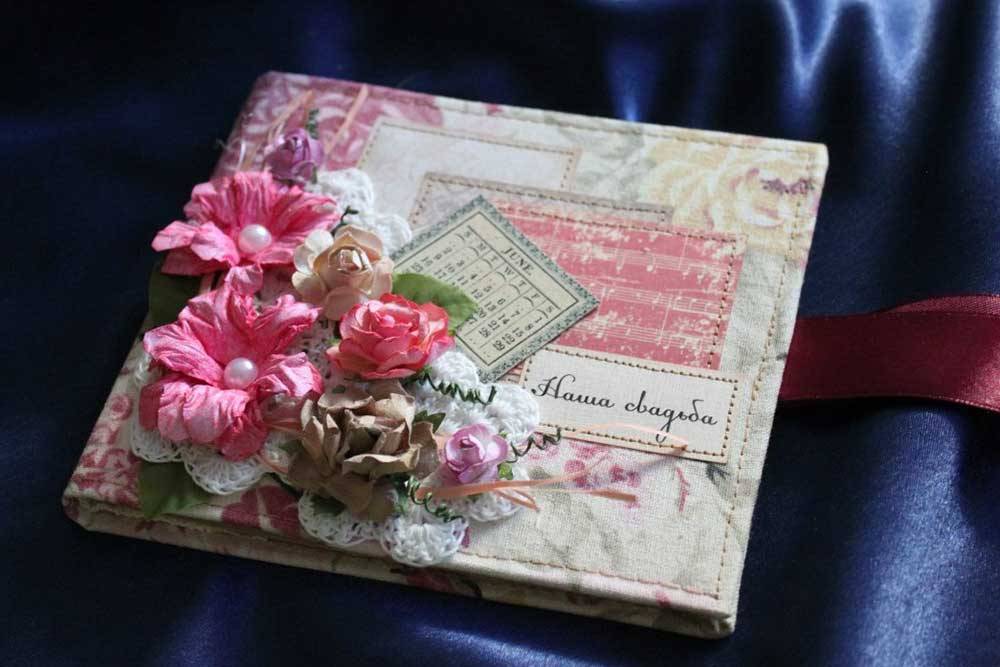 Красивый блокнот, дневник, книгу, открытку или альбом вовсе не обязательно декорировать полностью. Можно украсить только обложку, используя различные техники. Одним из самых популярных является стиль шебби шик. Для него обычно применяется ткань в мелкий цветочный рисунок. Она сочетается с картонными, металлическими и деревянными элементами. Подвески, завязки из атласных лент, тканевые цветы различного размера — всё это можно использовать в качестве декора.