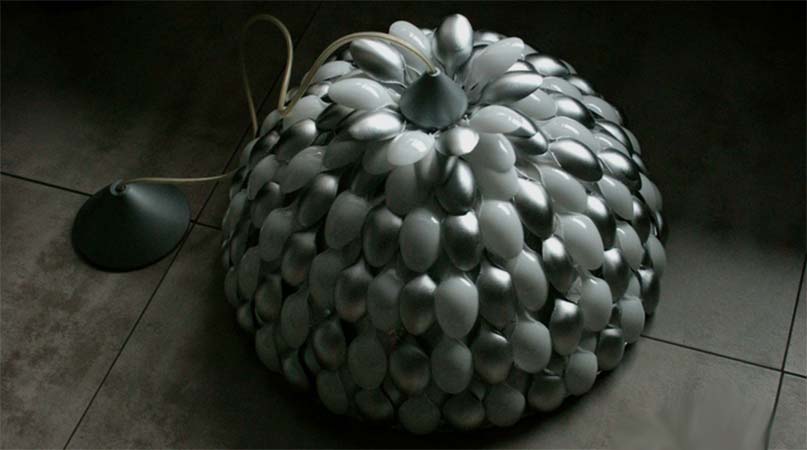 Такой осветительный прибор делается выполнить из стекла, пластика или даже дерева. Для дополнительной индивидуальности можно добавить другие элементы из бумаги, картона. Используются в изготовлении и старые компьютерные диски. Имеет смысл рассмотреть самый необычный, но в то же время простой вариант подобного изделия – люстру из пластиковых ложек.