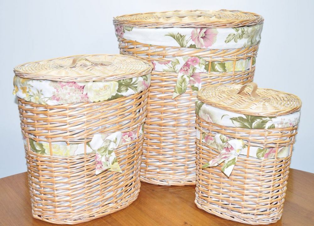 Для их изготовления используют солому, бамбук, лозу, ротанг. Все эти материалы относятся к экологическим. Чтобы защитить от опасных микроорганизмов готовые изделия покрывают лаком. Встречаются плетеные корзины с деревянным основанием, а боковые стенки выполнены из веревки. Цвет плетений близок к натуральному: бежевому, коричневому, молочному, серому. Часто плетеные емкости продаются с чехлом, который всегда можно постирать. Они изготовляются угловыми разновидностями, в виде шкафчиков даже с отделениями, прямоугольные, овальные из разноцветной лозы с прикрепленной крышкой.