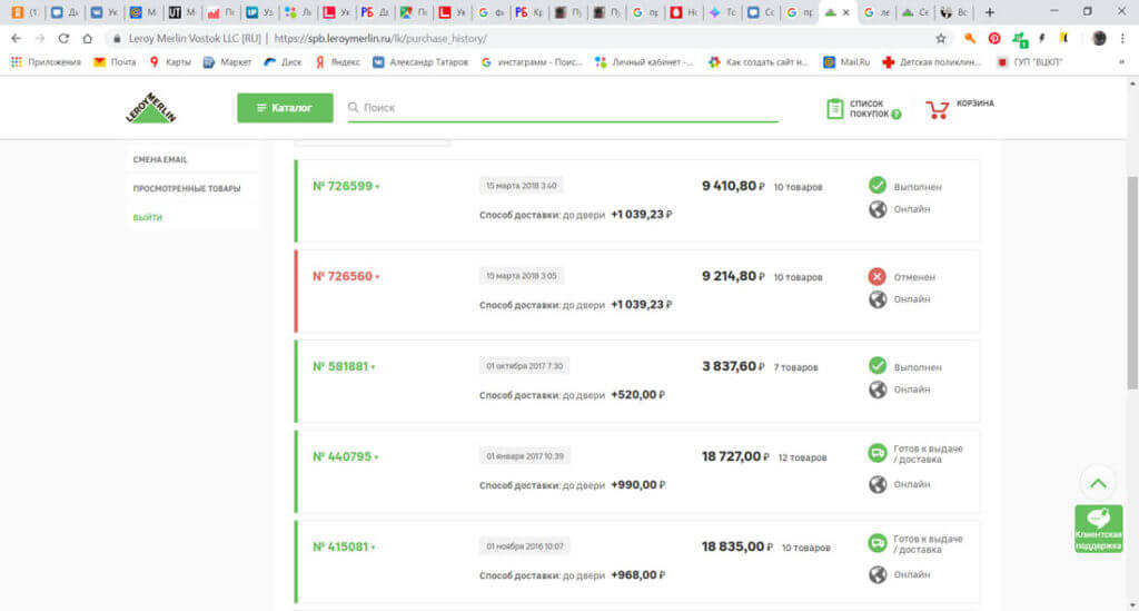История покупок в магазине Леруа Мерлен без сервисной карты