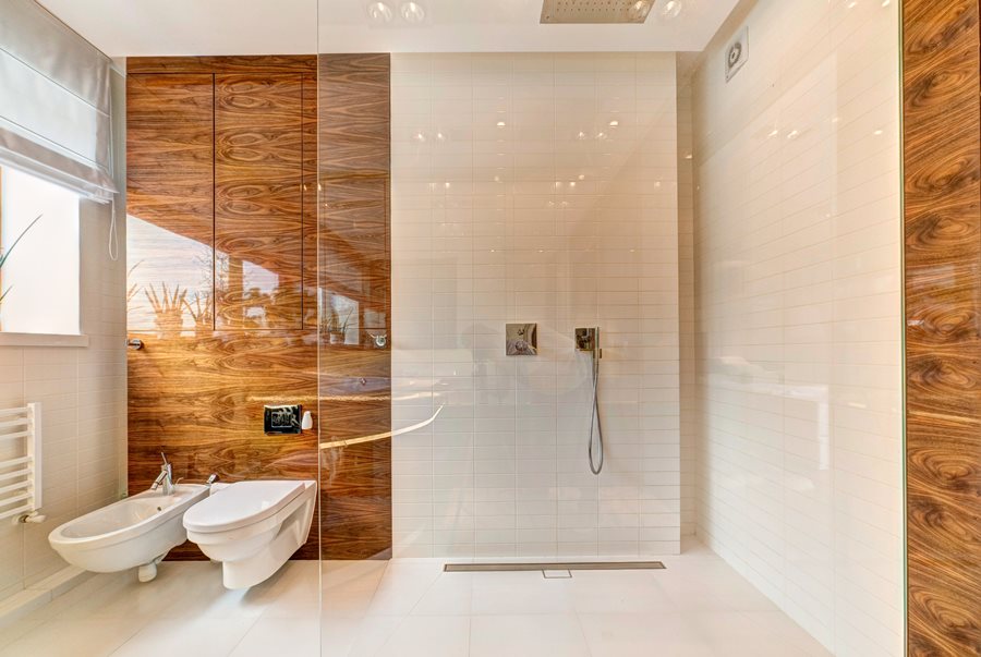 Использование перегородок позволяет сохранить визуальную целостность комнаты. Конструкции, сделанные, например из гипсокартона, уменьшают пространство, а стеклянные благодаря своей прозрачности не оказывают никакого влияния на визуальное восприятие комнаты для водных процедур.