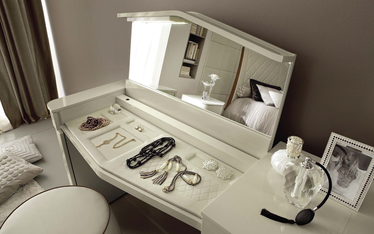 Любой девушке нужно личное пространство, в котором она может хранить косметические принадлежности, выполнять повседневный и выходной мейк-ап. Для просторного помещения спальной комнаты будет украшением размещение дамского столика с зеркалом. Дополнить его при необходимости следует подсветкой. Модельный ряд изделий достаточно широк, можно выбрать идеальное решение для обустройства женской территории.