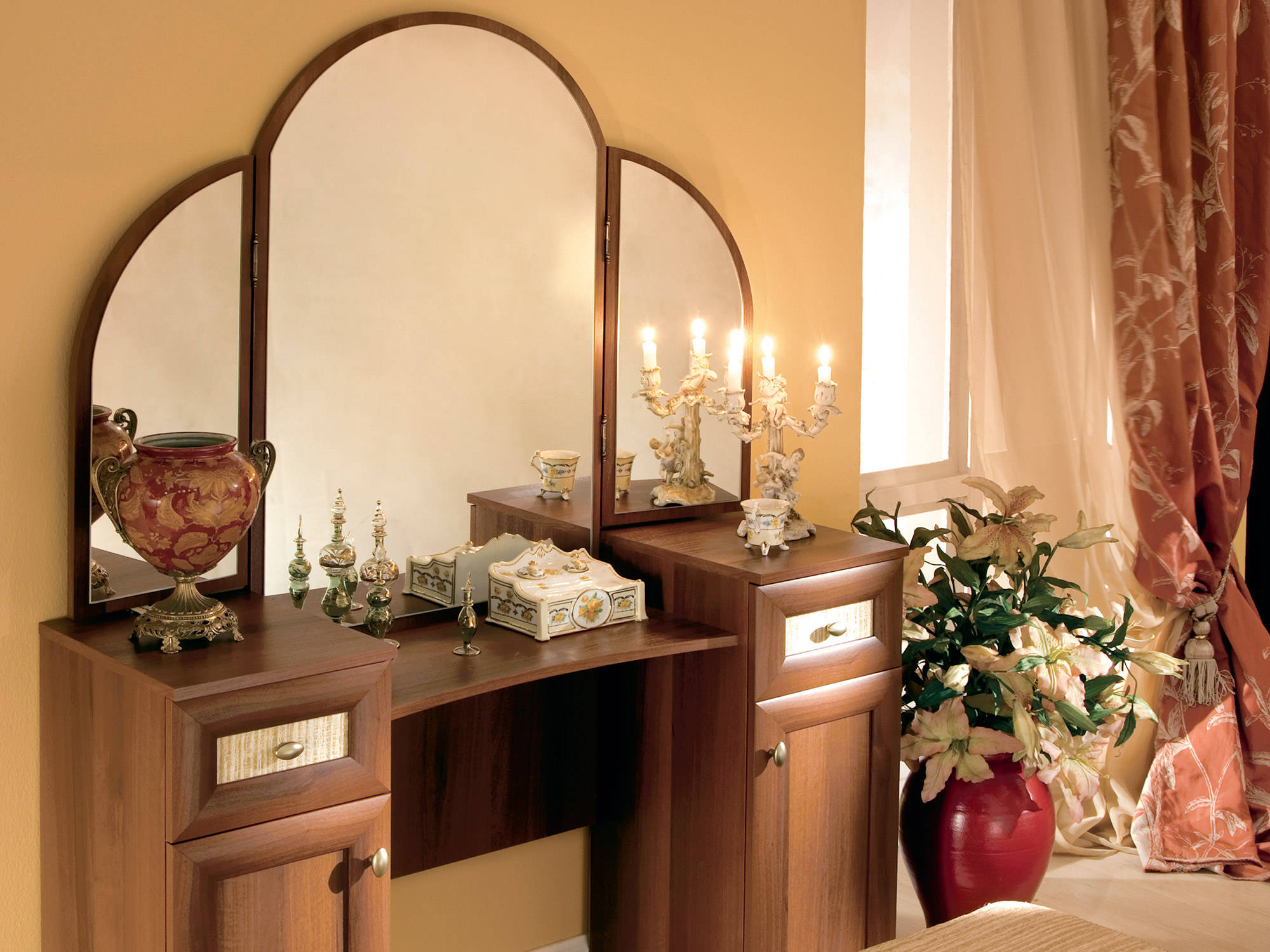 большое зеркало для туалетного столика с подсветкой совершенно необходимо для любой девушки. Одним из вариантов можем быть трельяж с распахивающимися зеркальными створками. Подвижные полотна позволят детально рассмотреть все нюансы прически и макияжа;