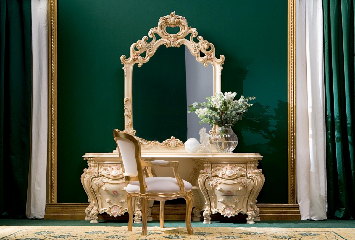 В качестве декора в оформлении туалетных столиков используют кованые элементы – оригинальные подставки, золотистые ручки и крючки придадут шика и богатства вашему туалетному столику.
