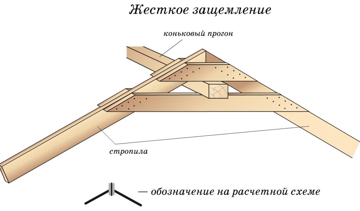 - не жестким болтовым соединением стропил внахлест на коньке.