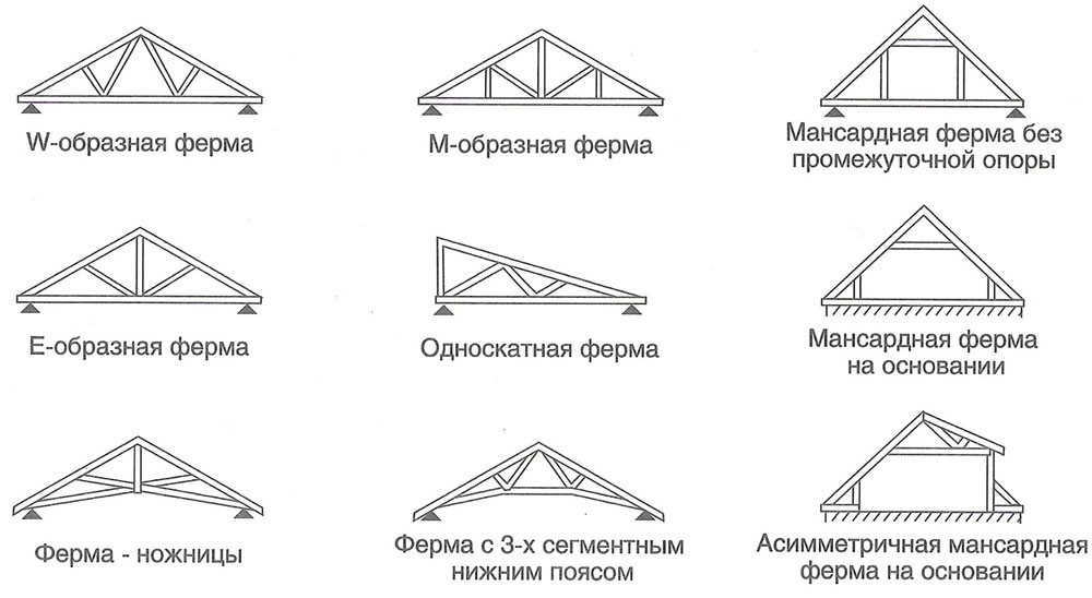 На фото представлены основные виды стропильных систем двухскатной крыши. Некоторые из них можно собрать своими руками, для устройства других потребуются профессиональные расчеты и монтаж.