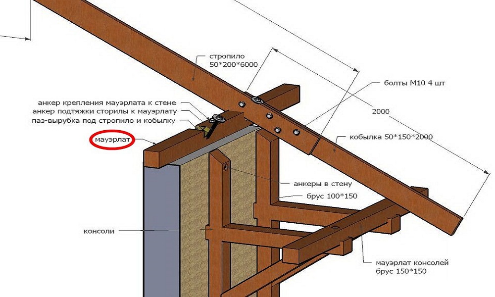 Мауэрлатный брус укладывают по стене, к которой будут крепить стропила. В домах из пористых материалов (пенобетона, кирпича) мауэрлат необходимо устанавливать по всей длине. В других случаях достаточно уложить брус между стропильными ногами. В качестве креплений используют анкерные болты, деревянные нагели, металлические скобы, шпильки или арматуру, шарнирные крепления или проволоку.