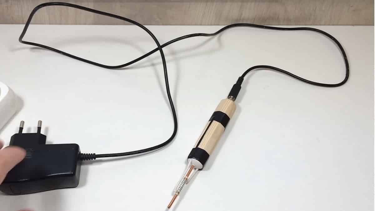 К обычному гнезду, подходящему к адаптеру от старого телевизора, я припаял 2 провода – красный и чёрный, которые были протянуты сначала через центр, а после разведены по двум сторонам ручки сквозь более тонкие отверстия. Гнездо для подключения штекера от блока питания было погружено в рукоятку с торца, после чего зафиксировано при помощи термоклея. Остывает он быстро, после чего, соединение становится достаточно жёстким.