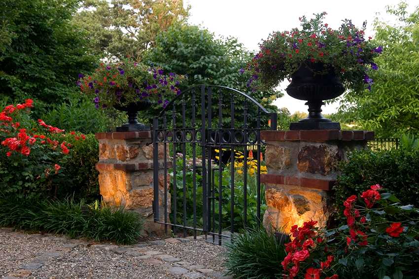 Парадный вход в прямом смысле этого слова обеспечат кованые ворота в стиле барокко или ренессанс. Они придадут торжественности любой усадьбе. Чаще всего такие кованные элементы декора, как беседки, качели, лавочки, и, конечно, ворота, выполняются в большим количеством дополнительных элементов, чаще всего спиралей и завитков.