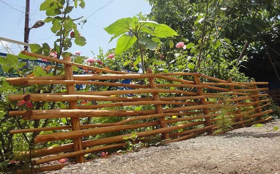 Всё чаще можно встретить плетёные заборы. Это традиционные плетни, которые легко сделать из заранее срезанных и заготовленных ивовых прутьев, веток лозы, орешника, малинника, вишнёвых веток, камыша. Простые в изготовлении, они прекрасно сочетаются практически с любыми растениями. При определённых навыках можно соорудить забор-корзину для клумбы. Плетение может быть горизонтальным и вертикальным. Новичкам лучше начать с вертикального плетения, чтобы понять принцип работы. Если плетень изготовить весной из необработанных веток ивы, получится живая изгородь, поскольку ива хорошо и быстро укореняется.