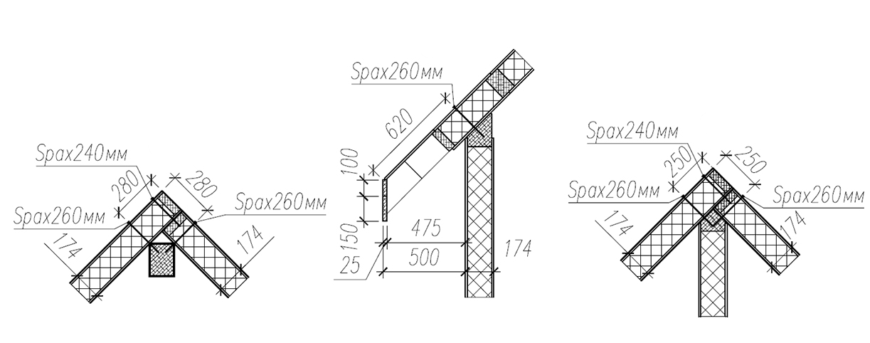 Все элементы каркаса кровли сплачиваются между собой оцинкованными саморезами 8х280 мм, по одному в каждой точке крепления. При необходимости в некоторых местах используются металлические соединительные пластины-накладки с отверстиями для шурупов.