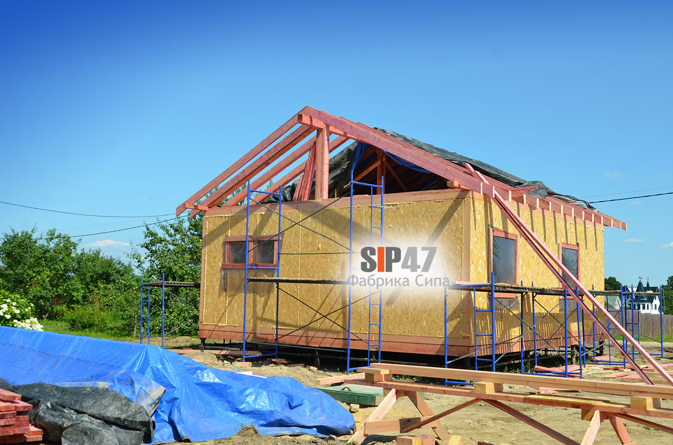 Конструкция относится к категории каркасных и в первом приближении порядок действий выглядит как сооружение несущего металлического, как правило, каркаса, обшивка сэндвич панелями и устройство других узлов – конька, водостока и тому подобное. Монтаж системы характеризуется определенными особенностями, вполне выполнимыми своими руками. На фото – конструкция из SIP-панелей.