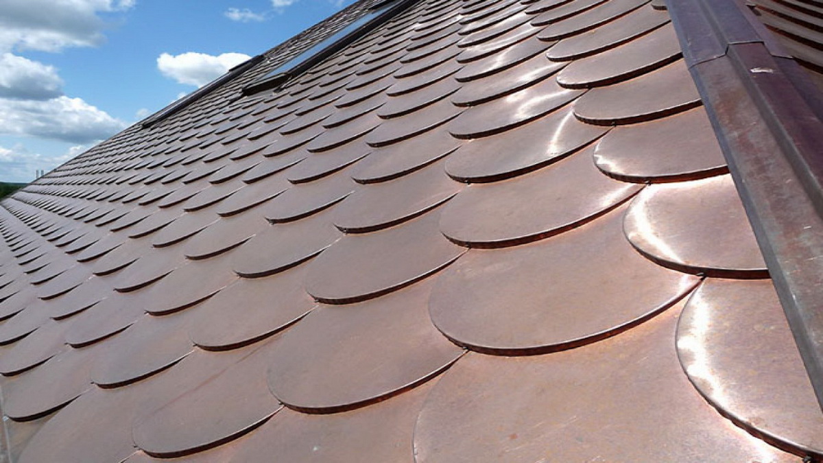 Медь – мягкий, пластичный материал, с помощью которого можно изготовить и возвести кровельное перекрытие любой формы, а также уклона. Черепичная конструкция – красивое, но одновременно с этим сложное, состоящее из отдельных компонентов (черепков), которые укладывают внахлест таким образом, чтобы образовался интересный рисунок.