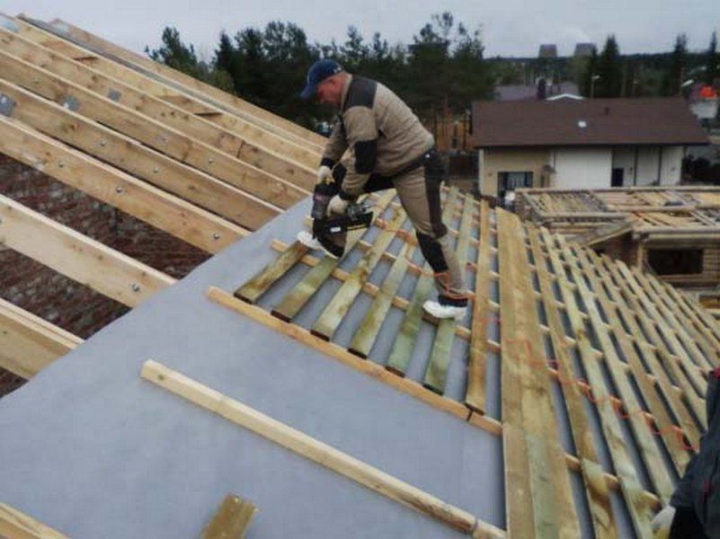 Обрешетка монтируется поперек стропильных ног.