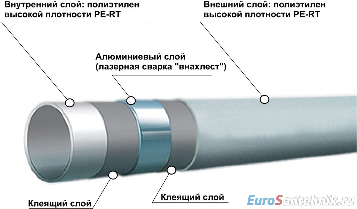 - Композитного материала «металлопластик», состоящего из сшитого полиэтилена (внутренний слой), алюминия (армирующая вставка) и ординарного полиэтилена (внешняя оболочка).