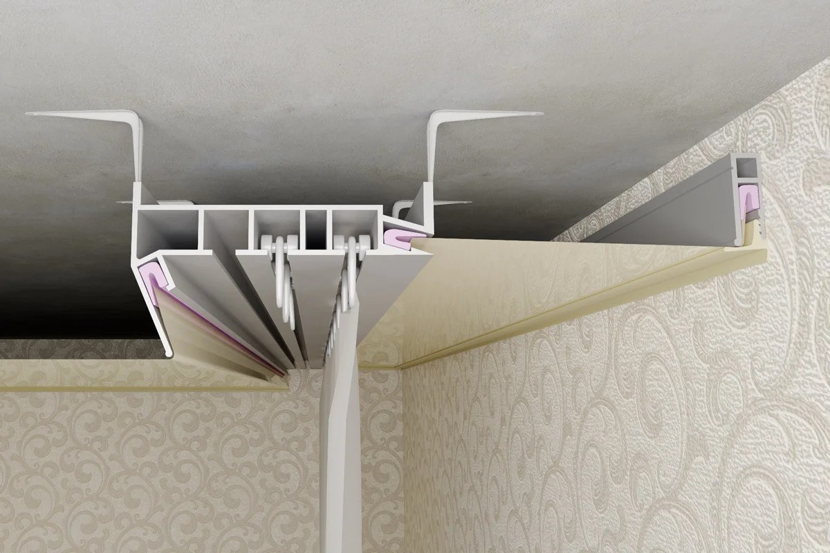 Скрытые потолочные карнизы для штор устанавливаются на натяжной потолок тремя способами: