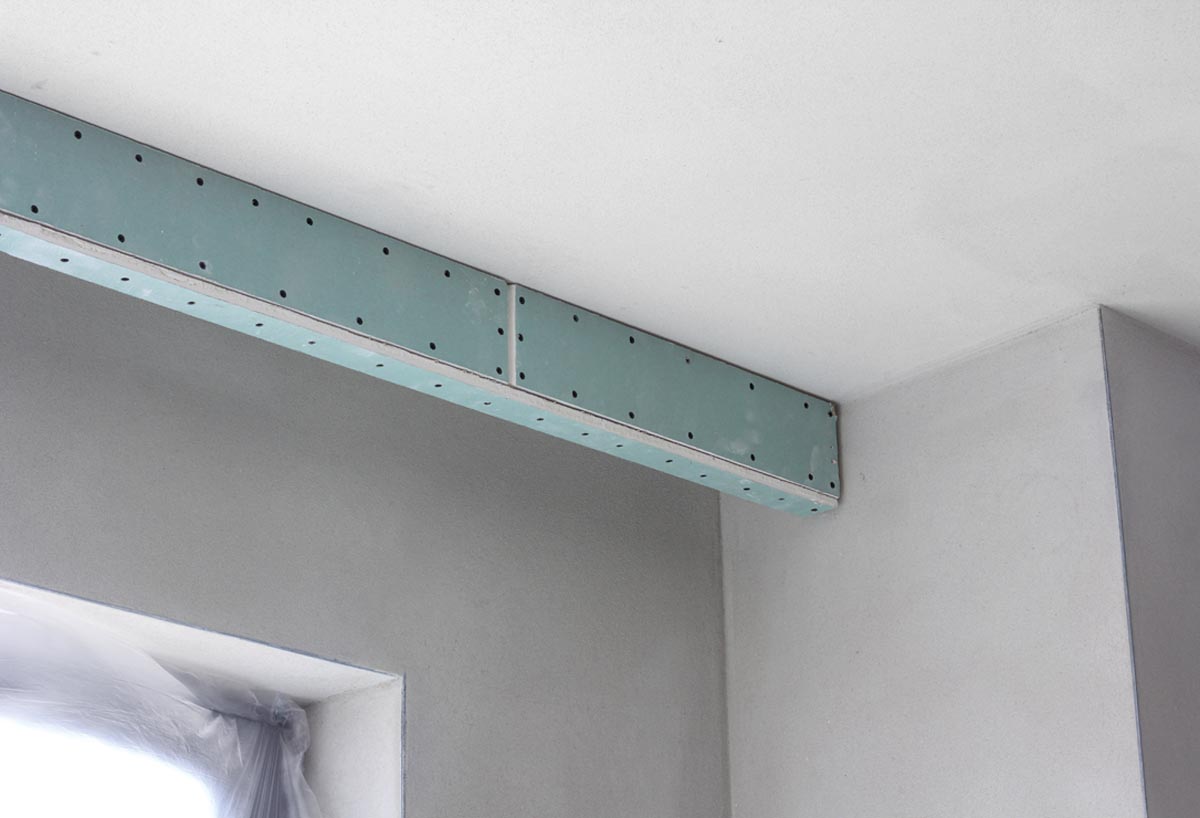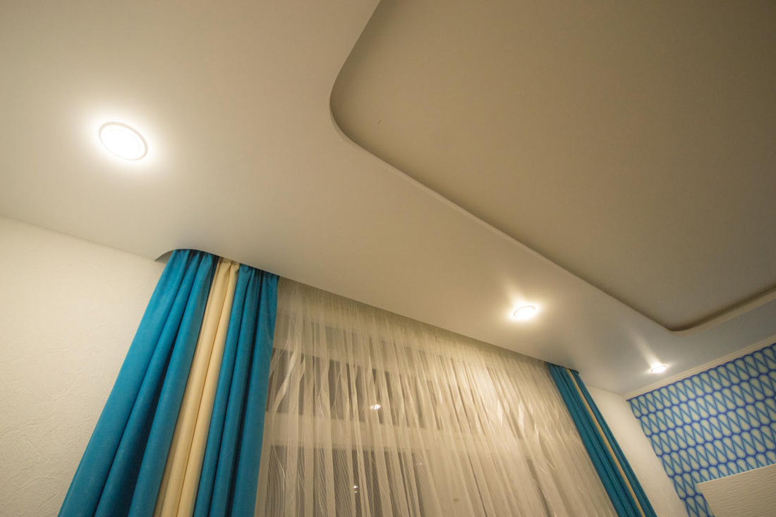 - Установка короба из гипсокартона. Позволяет установить также полосу из точечных ламп вдоль портьер.