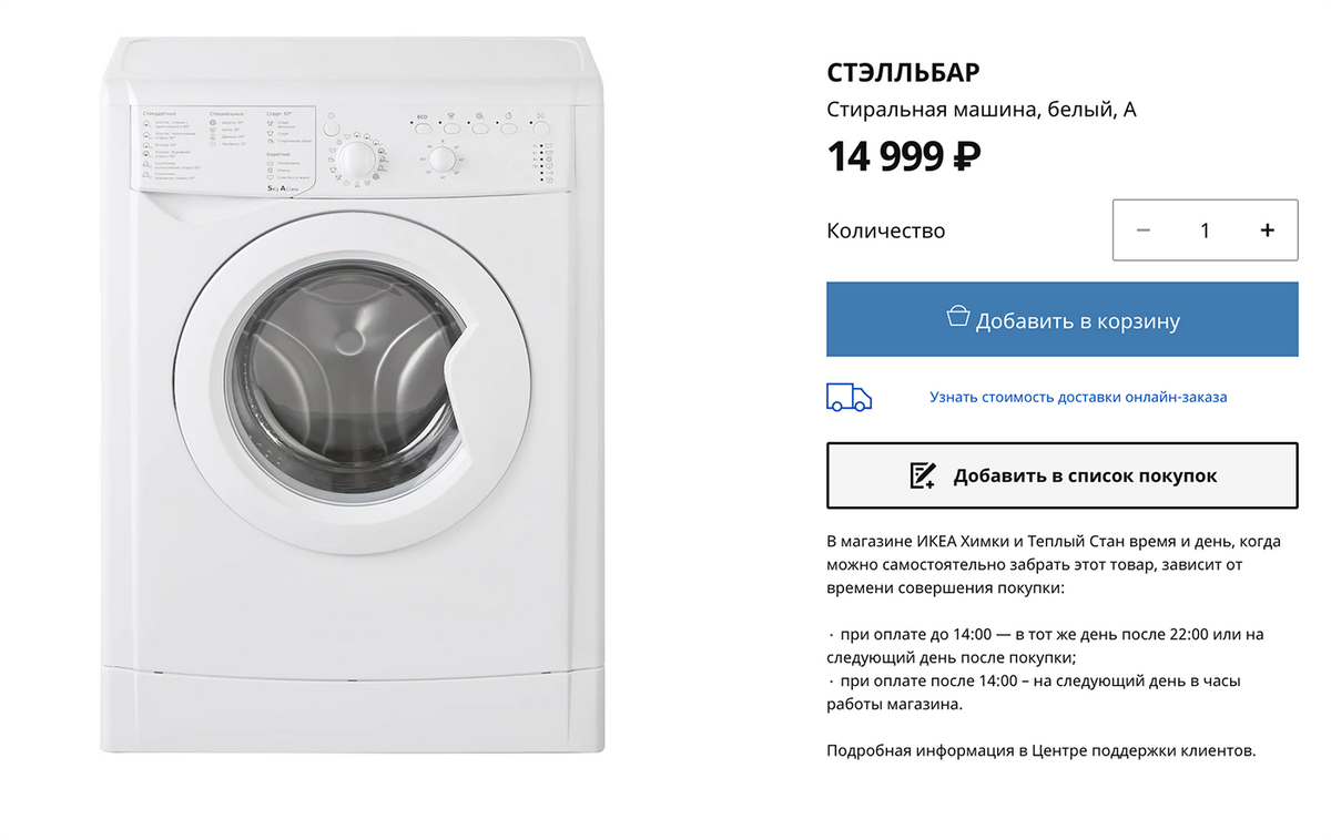 В Икее самая бюджетная стиральная машина стоит 15 тысяч. Выбор бытовой техники здесь небольшой, и нет особых отличий по дизайну и функционалу от привычной техники из «М-видео» или «Эльдорадо». Поэтому покупать в Икее технику удобно, только если берете здесь мебель и решили захватить стиральную машину за компанию.