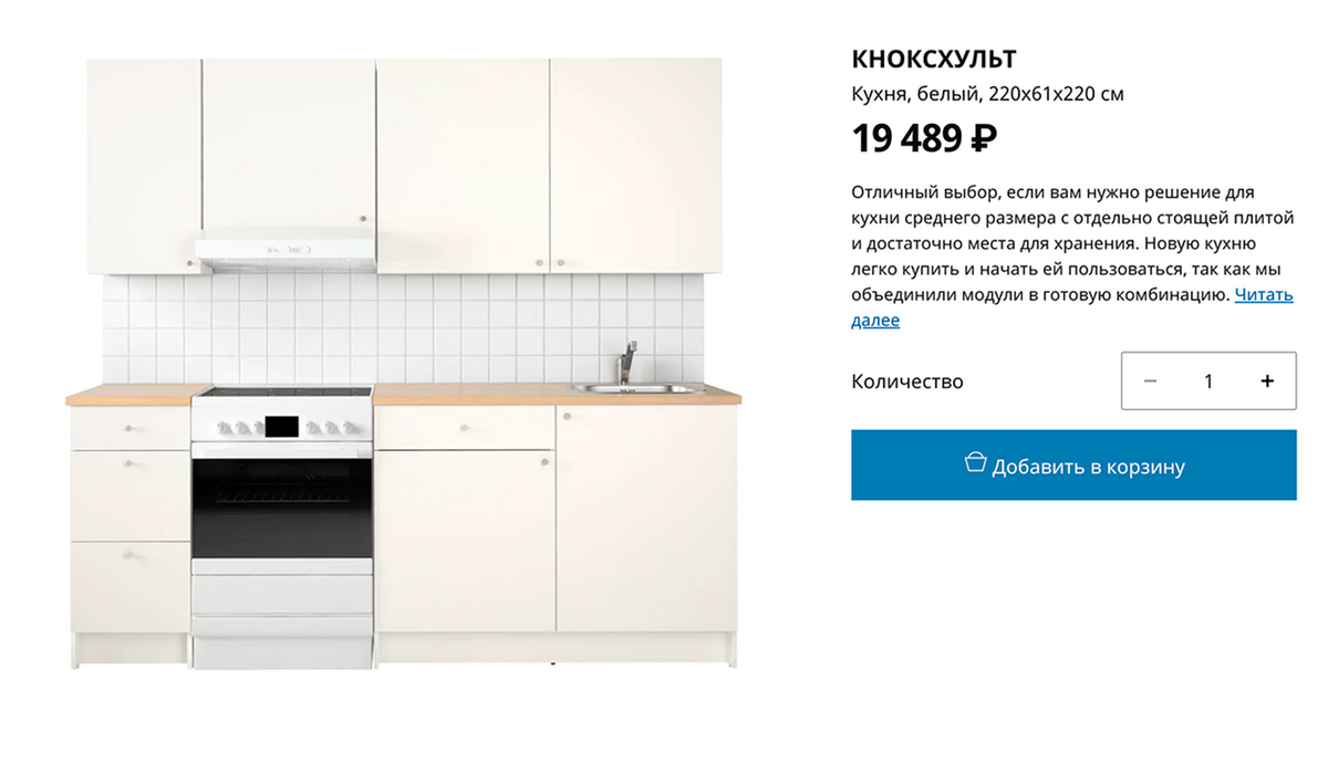 Икея. И снова дороже всего в Икее. Белый гарнитур шириной 220 см для минималистичного интерьера стоит 19 489 Р. Но в комплекте мойка и смеситель — это частично компенсирует стоимость. Плита может быть отдельно стоящей.