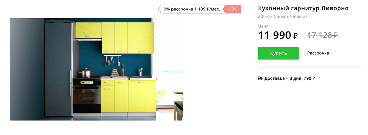 Мебельный магазин. Маленькая двухметровая кухня стоит 12 тысяч рублей. Такой вариант подойдет для кухни небольшого метража.