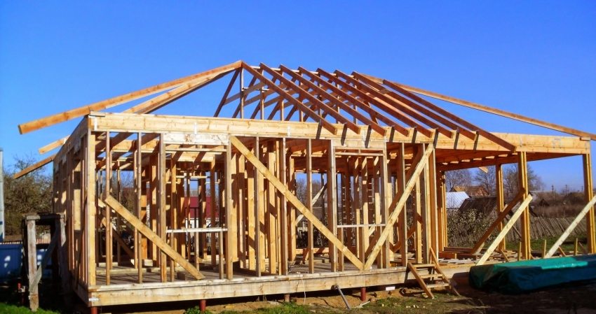 После сборки и подъема на высоту выполняется установка стропил двухскатной крыши деревянного дома. Чтобы зафиксировать их на мауэрлате, в нижней части стропил делают запилы. Первыми устанавливают две фермы с противоположных концов крыши.