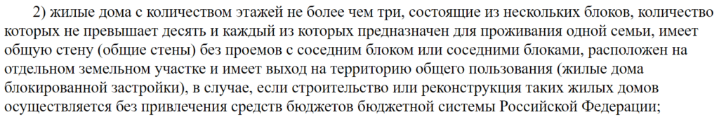По статье 49 ГрК РФ (часть 2), квартиры в доме типа «таунхаус» — часть единого здания. Если застройщик использует схемы долевого участия в строительстве жилого объекта, это распространяется и на оформление участка, примыкающего к дому. Точного определения нет, но из второго подпункта указанной статьи следует, что жилые дома, этажностью не более 3 и которые не превышают 10 блоков, имеют отдельный земельный участок и выход к нему.